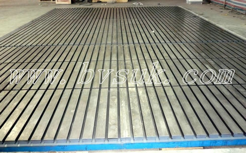 此建成的大型裝配平臺用于汽車裝配工作,總體承重達到35T左右,單塊橫向開T型槽23條,開口為28mm,平均分配,單塊凈重約11.2T左右,單塊精度2級,整體調試后的精度達到3級。這一批裝配平臺材質采用標準的HT200,回火處理2次,龍門刨床粗加工,合金銑刀開標準T型槽,后人工刮研,出廠前經過了我廠質檢部和三方質監局嚴格檢驗。